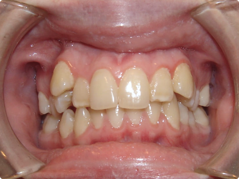 - Верхняя челюсть — неправильное положение клыков, короткое прикрепление уздечки верхней губы, кариес 6 зуба справа, кариес 4 зуба слева;