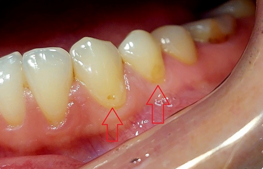 Осмотр показал нарушение эмали 2 зубов в пришеечной области. Для выявления глубины поражения и состояния корней повреждённых зубов, провели рентген-обследование. Состояние корней хорошее, нервы на проблемных зубах не повреждены. Окончательный диагноз – клиновидный дефект.